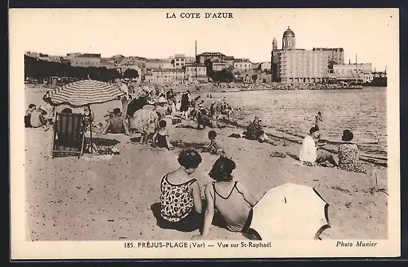 AK Fréjus-Plage, Vue sur St-Raphaël depuis la plage animée de la Côte d`Azur