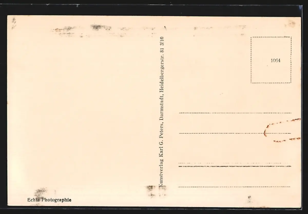 Personenbezogene Daten auf der Rückseite der Karte wurden durch blauen Textmarker unkenntlich gemacht. Die blauen Stellen sind auf die Vorderseite durchgeweicht und wirken sich negativ auf das Postkartenfoto aus