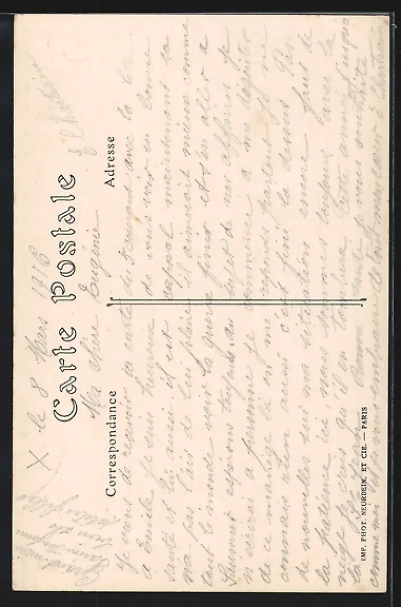 Personenbezogene Daten auf der Rückseite der Karte wurden durch blauen Textmarker unkenntlich gemacht. Die blauen Stellen sind auf die Vorderseite durchgeweicht und wirken sich negativ auf das Postkartenfoto aus