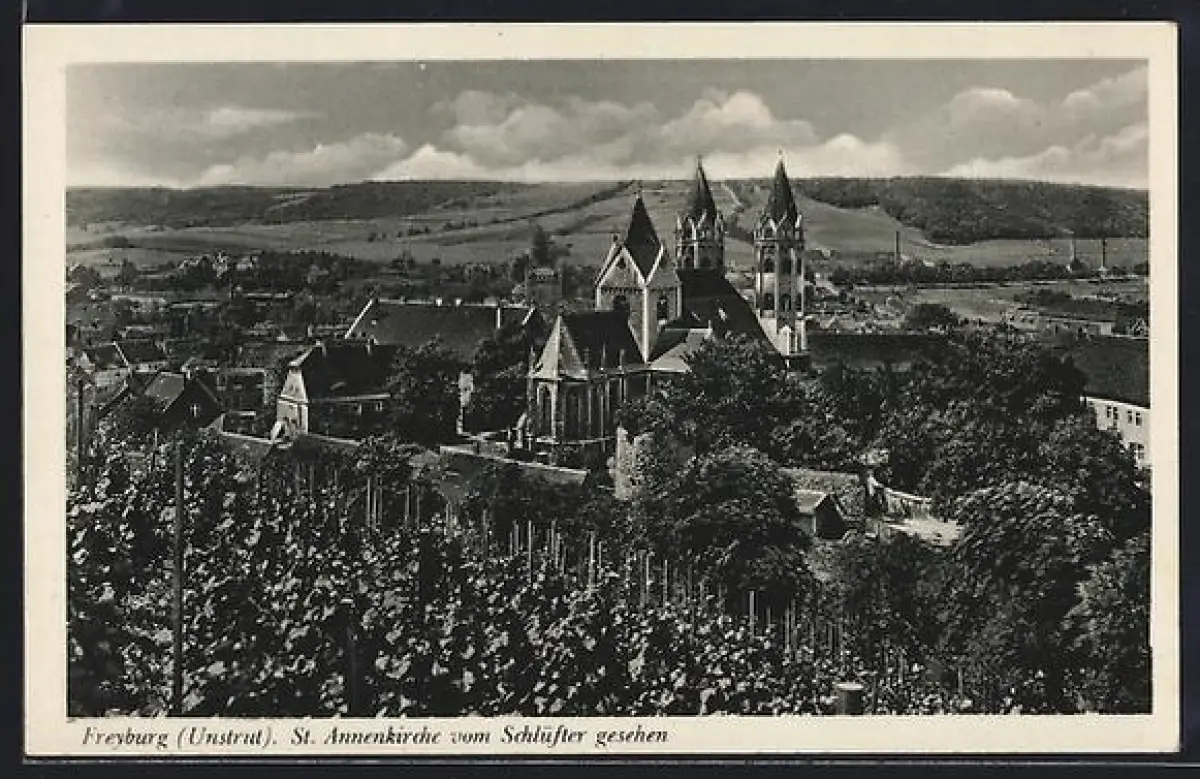 AK Freyburg /Unstrut, St. Annenkirche vom Schlüfter gesehen, Im Vordergrund Weinberg