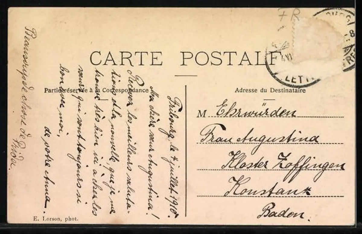 gelaufen 1910, Briefmarke entfernt, rückseitig Oberflächenschaden, guter Zustand