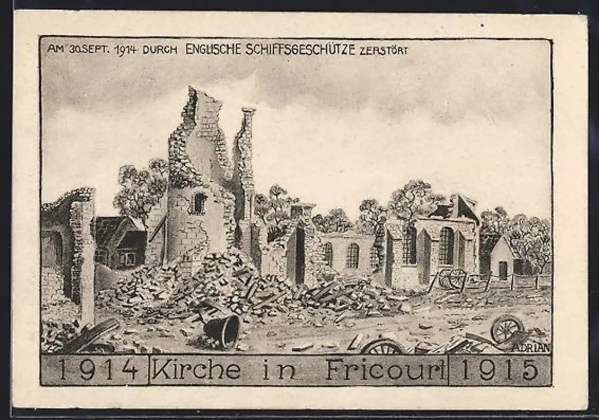 AK Fricourt, Église détruite par les tirs navals anglais en 1914