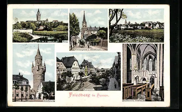 AK Friedberg, Färbergasse und Stadtkirche, Adolfsturm