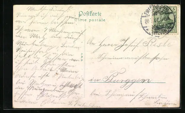 Personenbezogene Daten auf der Rückseite der Karte wurden durch blauen Textmarker unkenntlich gemacht. Die blauen Stellen sind auf die Vorderseite durchgeweicht und wirken sich negativ auf das Postkartenfoto aus