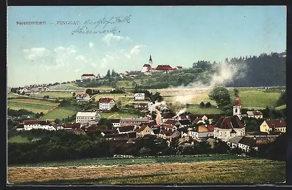 AK Friedberg, Pinggau, Ortsansicht mit Kirche und Rauch, Felder