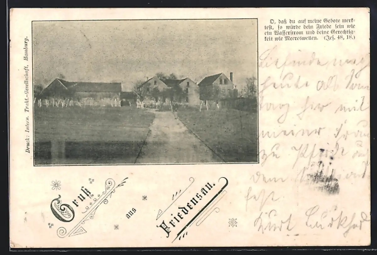 AK Friedensau, Dorfansicht mit mehreren Gebäuden und Weg