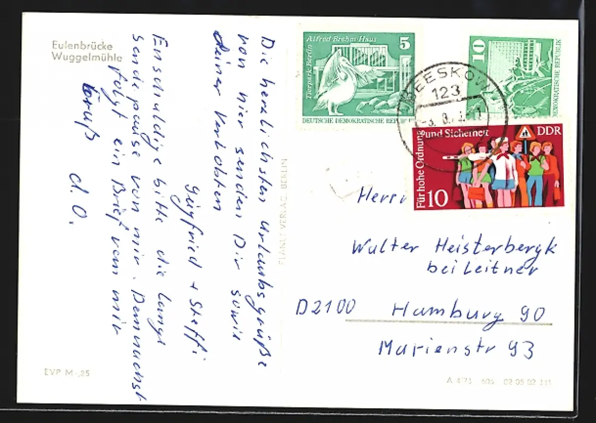 Personenbezogene Daten auf der Rückseite der Karte wurden durch blauen Textmarker unkenntlich gemacht. Die blauen Stellen sind auf die Vorderseite durchgeweicht und wirken sich negativ auf das Postkartenfoto aus