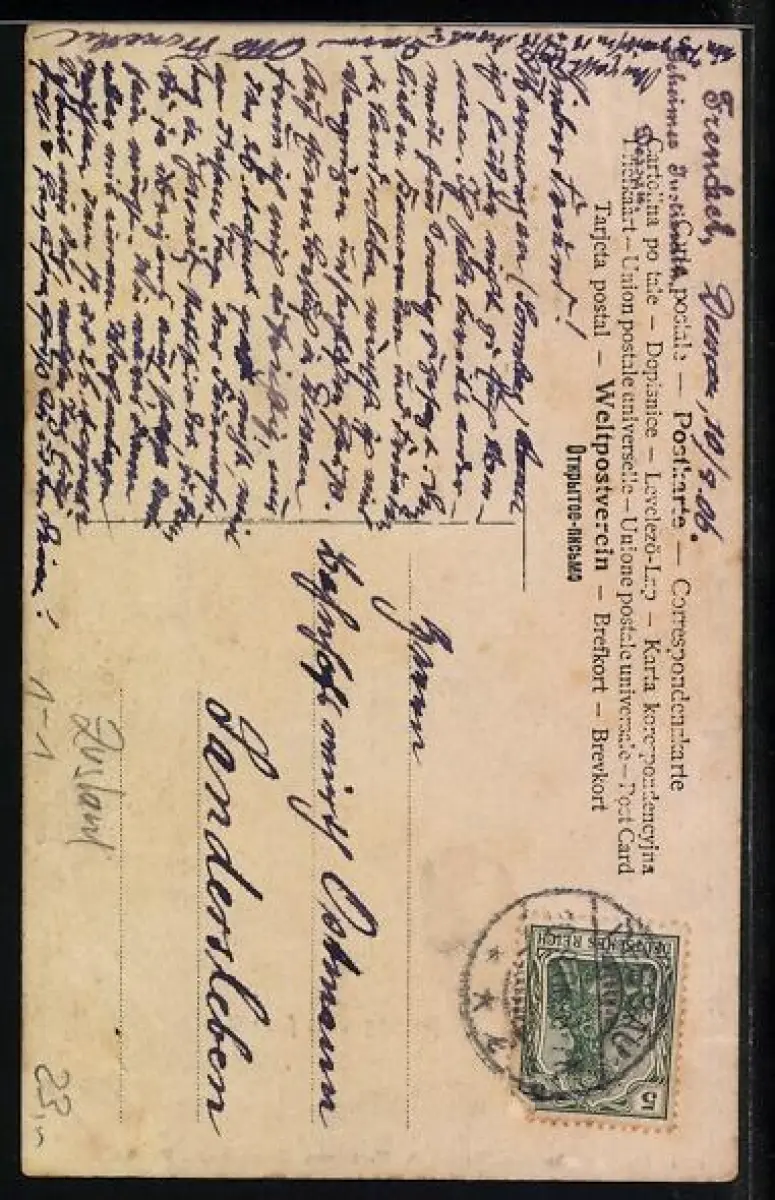alte Ansichtskarte, gelaufen, Stempelspur, große Eckknicke rechts unten und links oben, Bugspur links unten