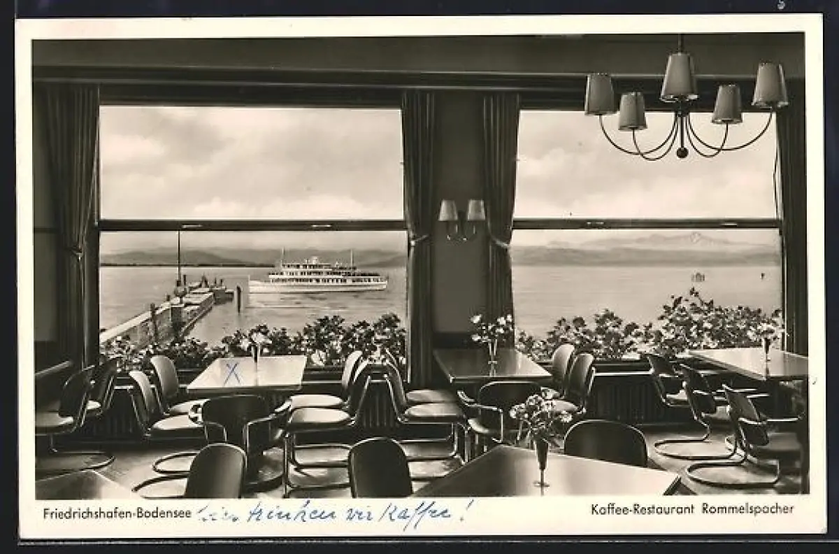 AK Friedrichshafen /Bodensee, Kaffee-Restaurant Rommelspacher, Blick auf Hafen und Bodensee