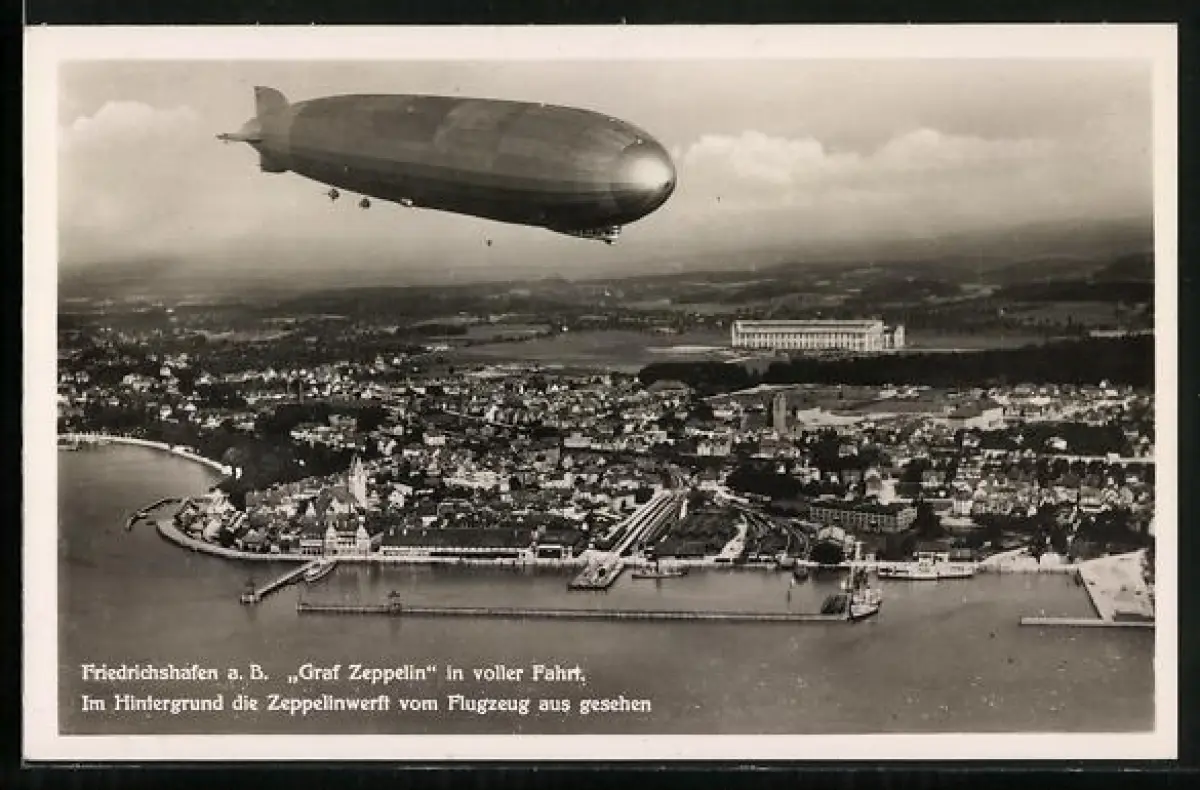 AK Friedrichshafen, Graf Zeppelin in voller Fahrt, unten die Zeppelinwerft vom Flugzeug aus