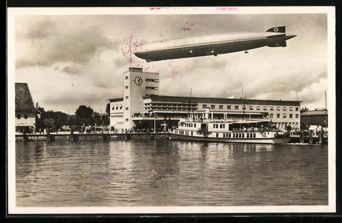 AK Friedrichshafen, Graf Zeppelin über dem Hafenbahnhof,