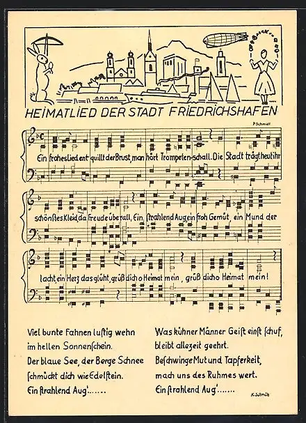 AK Friedrichshafen, Liedzeilen und Noten des Heimatliedes der Stadt, Ortsansicht mit einem Zeppelin