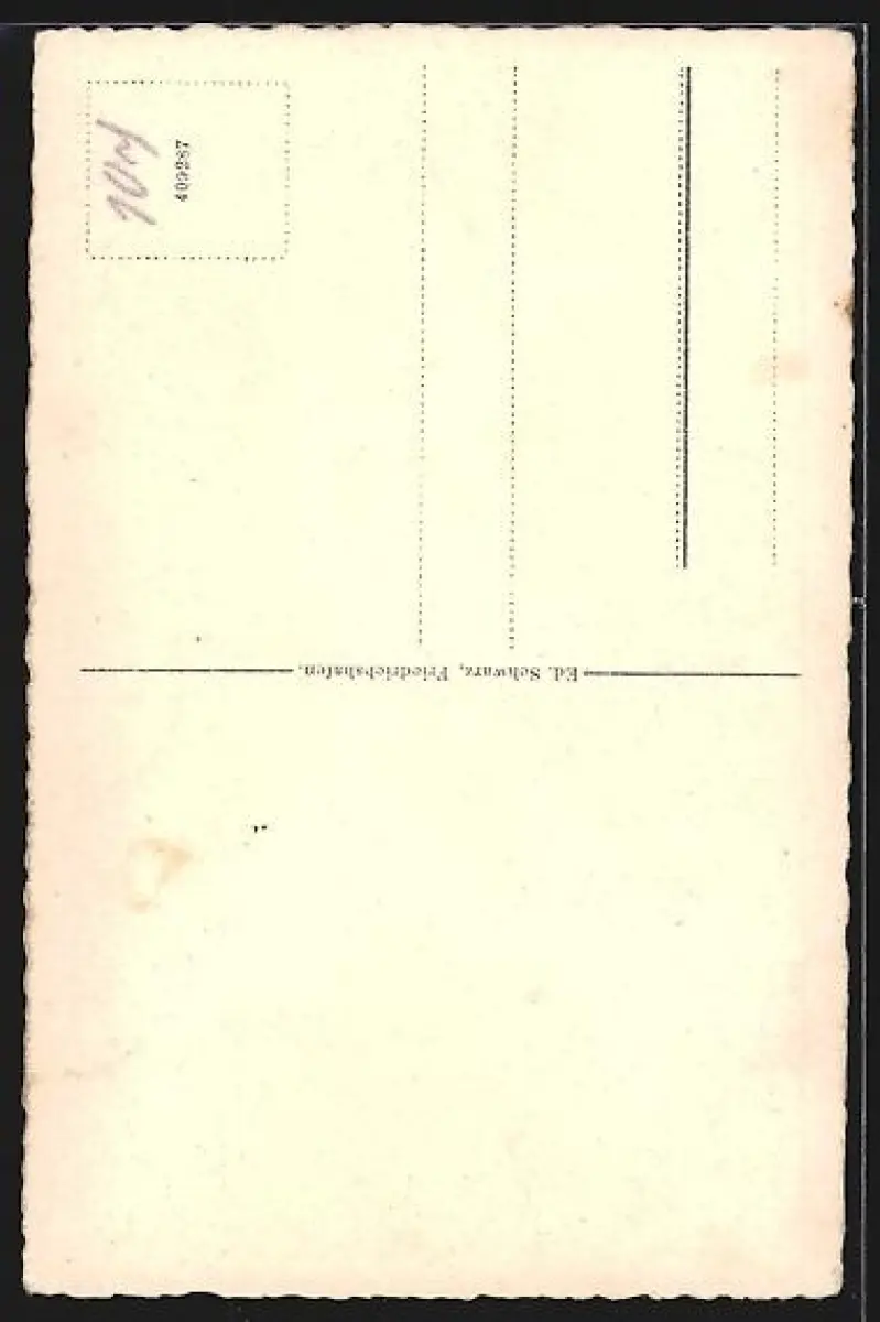 Personenbezogene Daten auf der Rückseite der Karte wurden durch blauen Textmarker unkenntlich gemacht. Die blauen Stellen sind auf die Vorderseite durchgeweicht und wirken sich negativ auf das Postkartenfoto aus