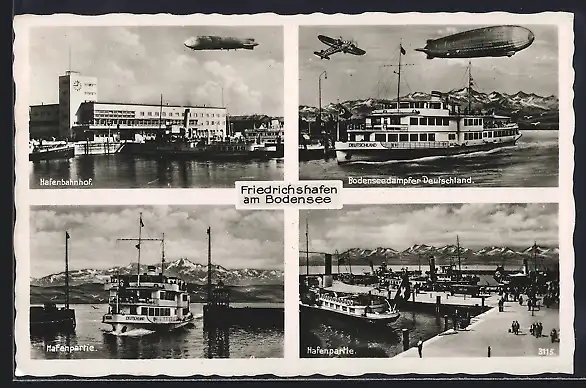 AK Friedrichshafen, Zeppelin mit Bodenseedampfer Deutschland & Hafenbahnhof