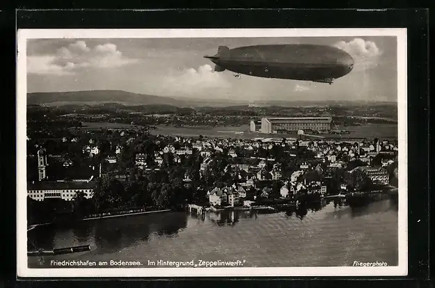 AK Friedrichshafen a. B., Gesamtansicht mit Luftschiff LZ127 Graf Zeppelin, Im Hintergrund Zeppelinwerft