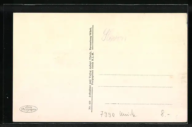Personenbezogene Daten auf der Rückseite der Karte wurden durch blauen Textmarker unkenntlich gemacht. Die blauen Stellen sind auf die Vorderseite durchgeweicht und wirken sich negativ auf das Postkartenfoto aus