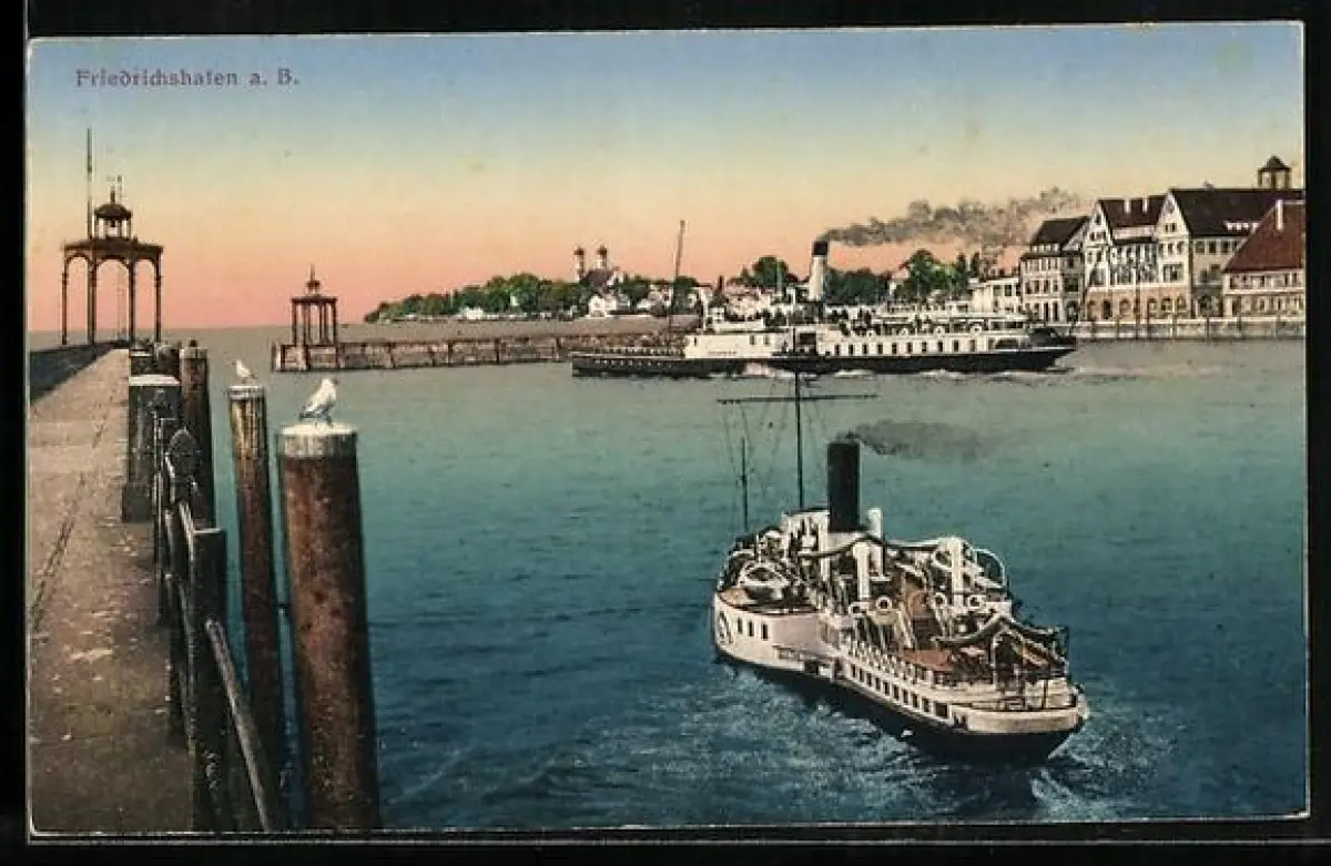 AK Friedrichshafen a. B., Hafen mit Dampfschiffen und Uferpromenade