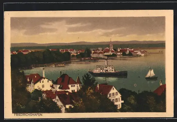AK Friedrichshafen a. B., Ortsansicht mit Bodensee und Dampfer