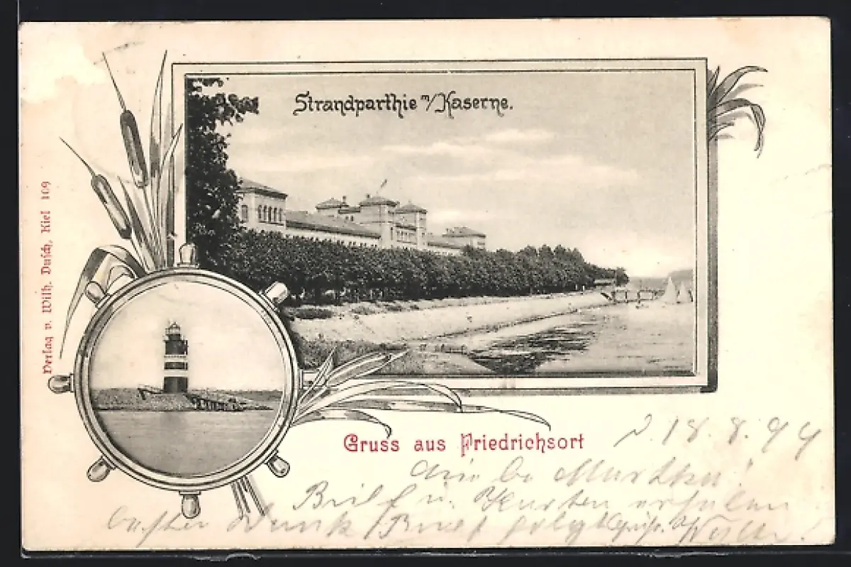 AK Friedrichsort, Strandpartie m. Kaserne, Leuchtturm