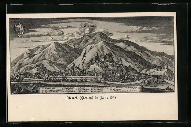 AK Friesach /Kärnten, Ortsansicht aus dem Jahre 1649 nach Merian