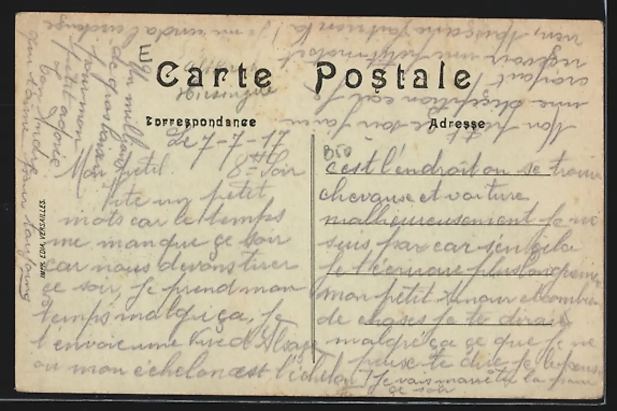 Personenbezogene Daten auf der Rückseite der Karte wurden durch blauen Textmarker unkenntlich gemacht. Die blauen Stellen sind auf die Vorderseite durchgeweicht und wirken sich negativ auf das Postkartenfoto aus
