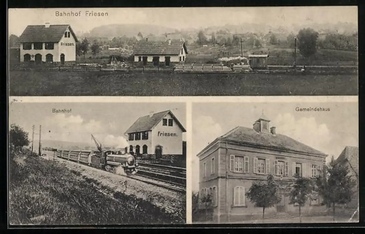AK Friesen, Bahnhof von Friesen mit einfahrendem Personenzug, Gemeindehaus