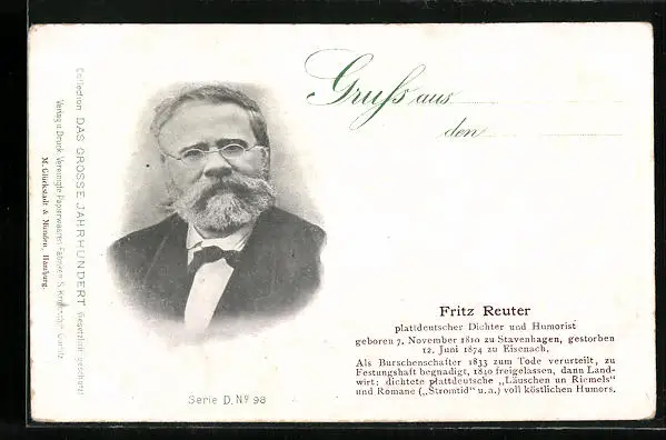 AK Fritz Reuter, plattdeutscher Dichter und Humorist, Serie D, Nr. 98