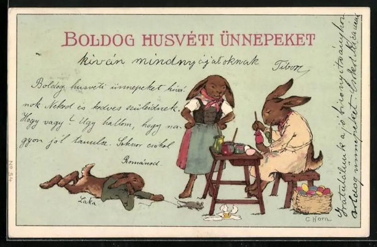 AK Fröhliche Ostern, Osterhasenfamilie malt Eier bunt an