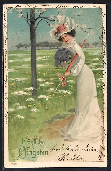 AK Fröhliche Pfingsten, Dame mit Blumenstrauss auf einer Frühlingswiese