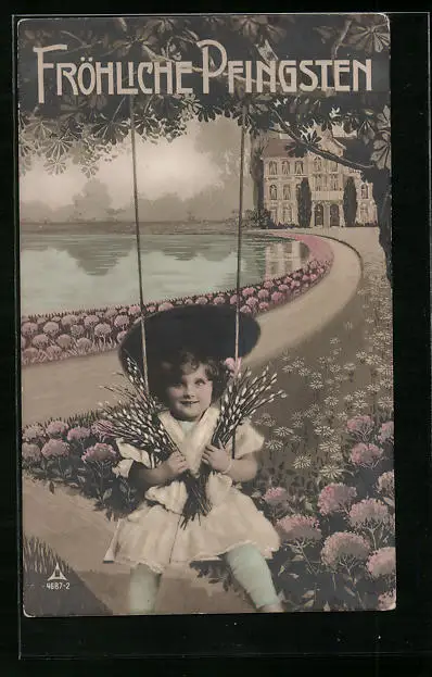 AK Fröhliche Pfingsten - Mädchen mit Maikätzchen auf einer Schaukel