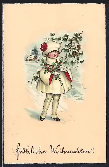 AK Fröhliche Weihnachten, Mädchen mit Mistelzweigen im Arm