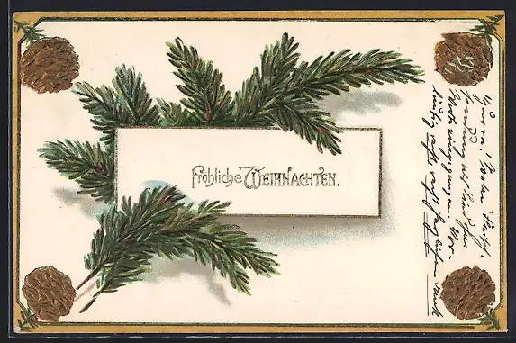 AK Fröhliche Weihnachten, Tannenzweig und -zapfen