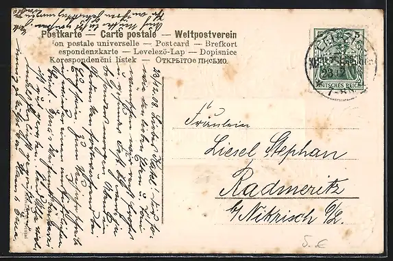 Personenbezogene Daten auf der Rückseite der Karte wurden durch blauen Textmarker unkenntlich gemacht. Die blauen Stellen sind auf die Vorderseite durchgeweicht und wirken sich negativ auf das Postkartenfoto aus