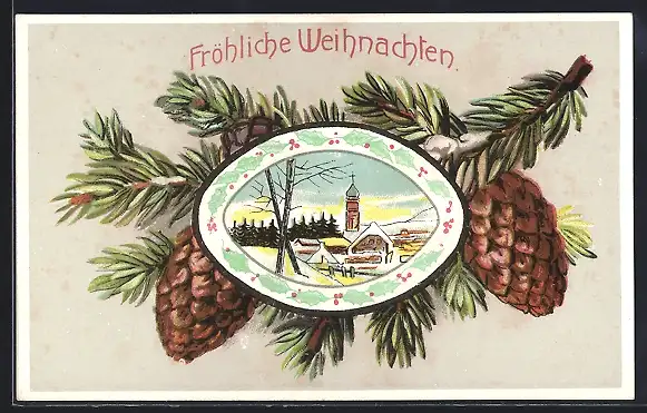 AK Fröhliche Weihnachten, Winterliches Dorf im Tannen-Passepartout