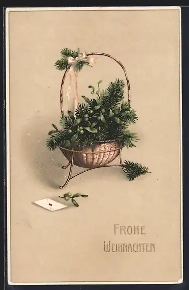 AK Frohe Weihnachten, Tannenzweig in einem Korb