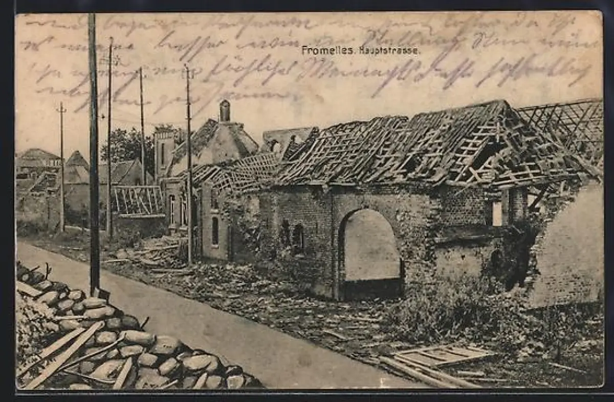 AK Fromelles, Hauptstrasse mit zerstörten Häusern