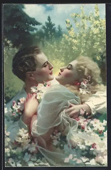 AK Frühling der Liebe, Liebespaar küsst sich