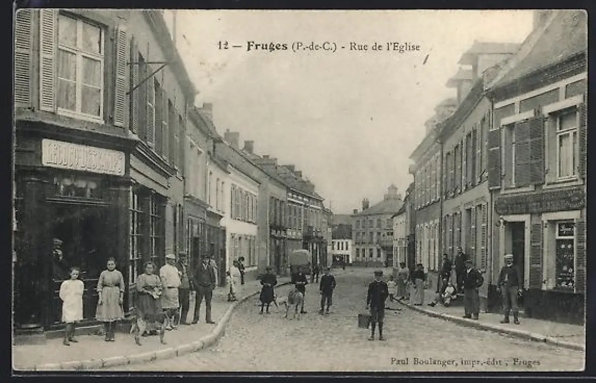AK Fruges /P.-de-C., Rue de l`Église avec habitants et commerces