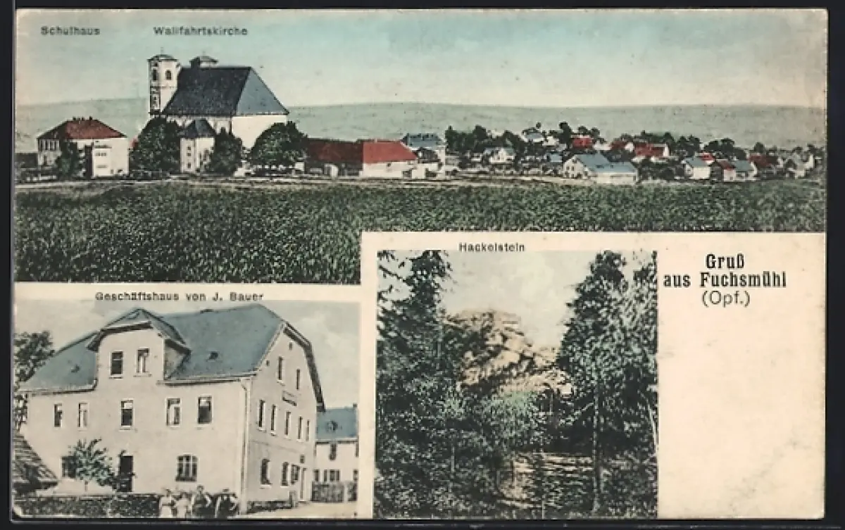 AK Fuchsmühl i. Opf., Schulhaus, Wallfahrtskirche, Gescäftshaus von J. Bauer und Hackelstein