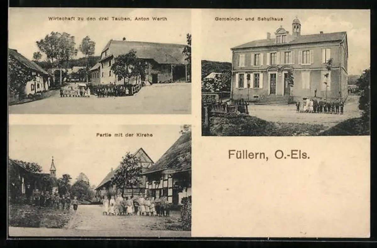 AK Füllern, Wirtschaft zu den drei Tauben v. Anton Werth, Gemeinde- und Schulhaus