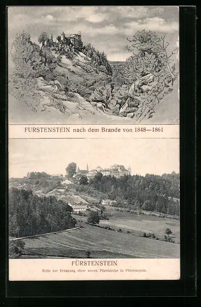 AK Fürstenstein, Ortsansicht mit neuerbauter Pfarrkirche, Ortsansicht nach dem Brande von 1848-1861