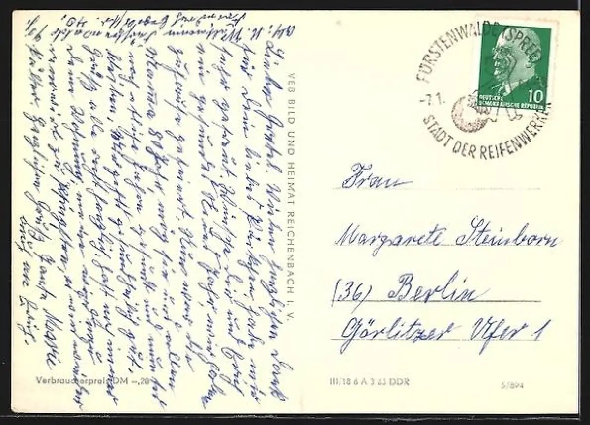 Personenbezogene Daten auf der Rückseite der Karte wurden durch blauen Textmarker unkenntlich gemacht. Die blauen Stellen sind auf die Vorderseite durchgeweicht und wirken sich negativ auf das Postkartenfoto aus