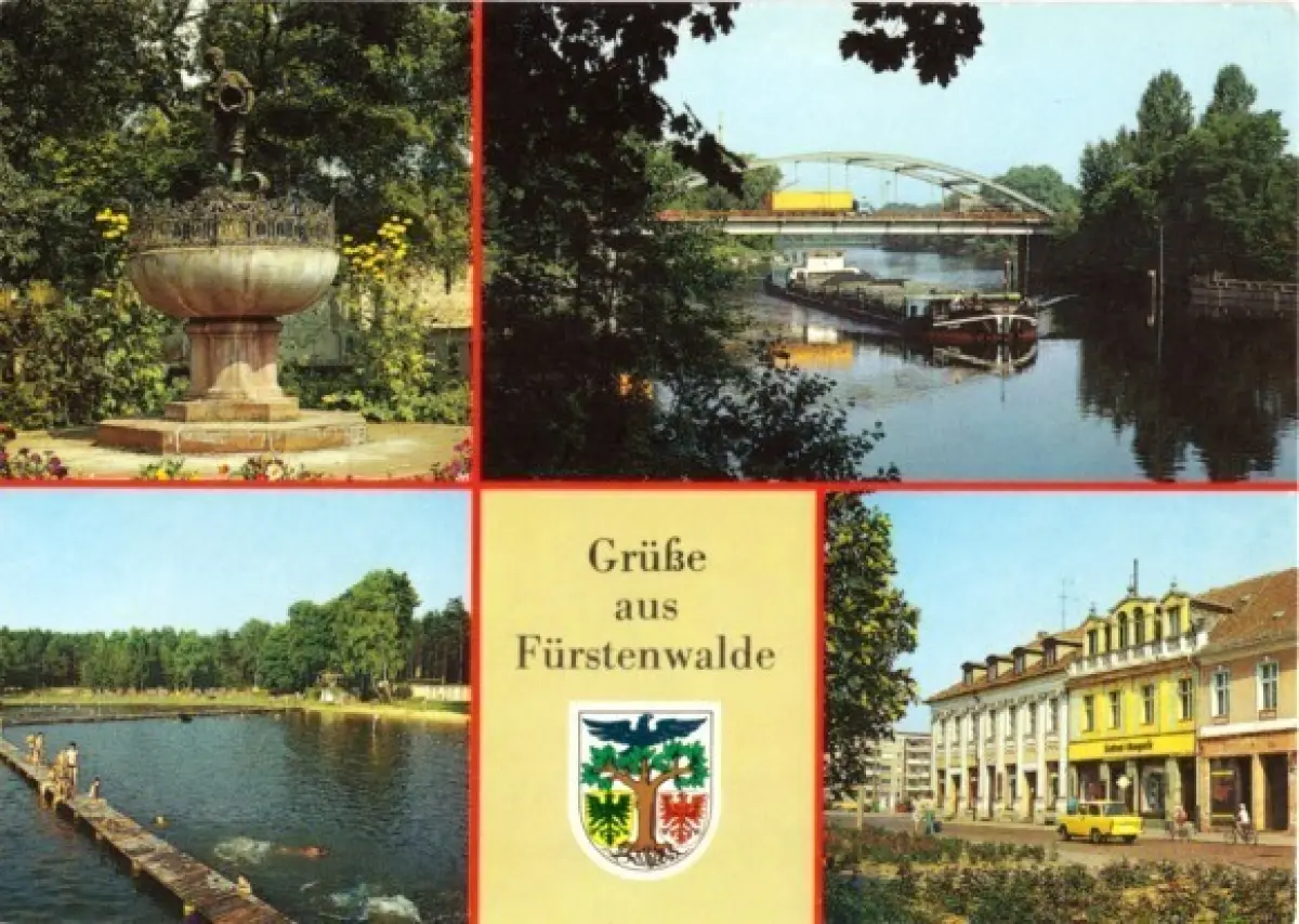 Ansichtskarte Fürstenwalde Spree vier Abb., Wappen Grassnik-Brunnen, Brücke der Thälmann-Pioniere, Naherholungsgebiet Petersdorfer See, Mühlenstr. Erhaltung I-II ungelaufen Druckvermerk: 1988 Herstellungsland: DDR Verlag: Bild und Heimat Reichenbach - 01 05 0430/07