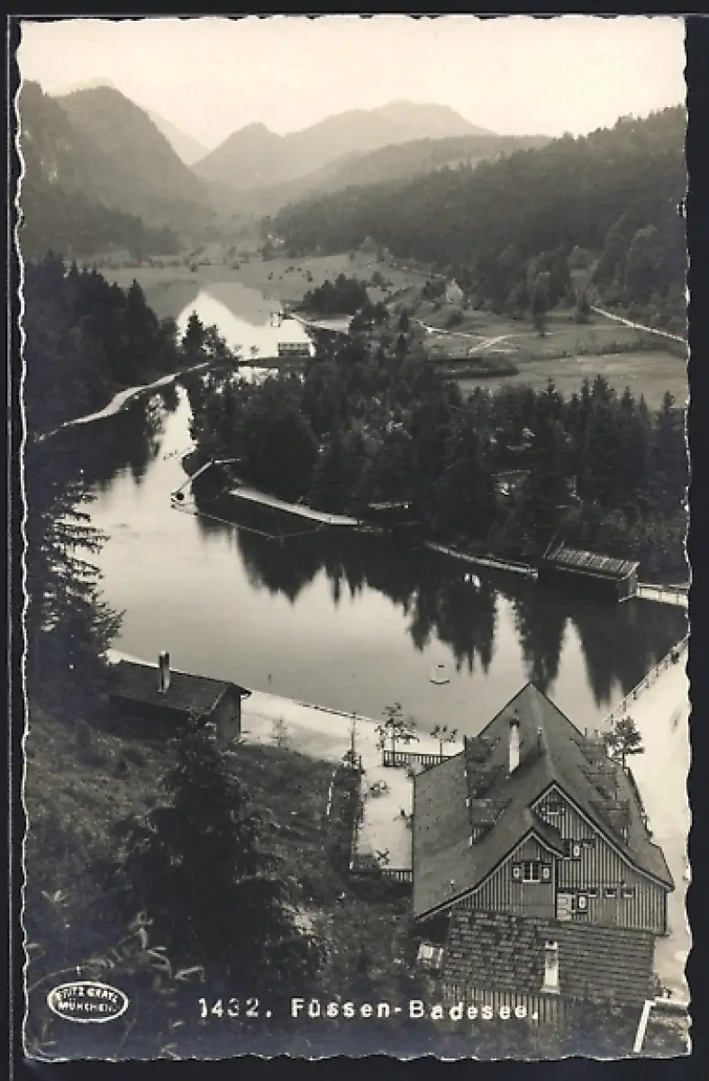 AK Füssen, Badesee mit Bade-Cafe aus der Vogelschau