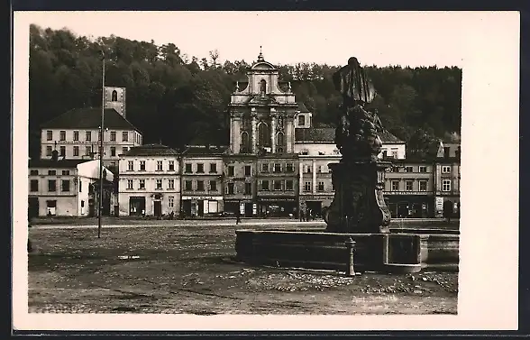 AK Fulnek, Ortspartie mit Geschäften und Brunnen