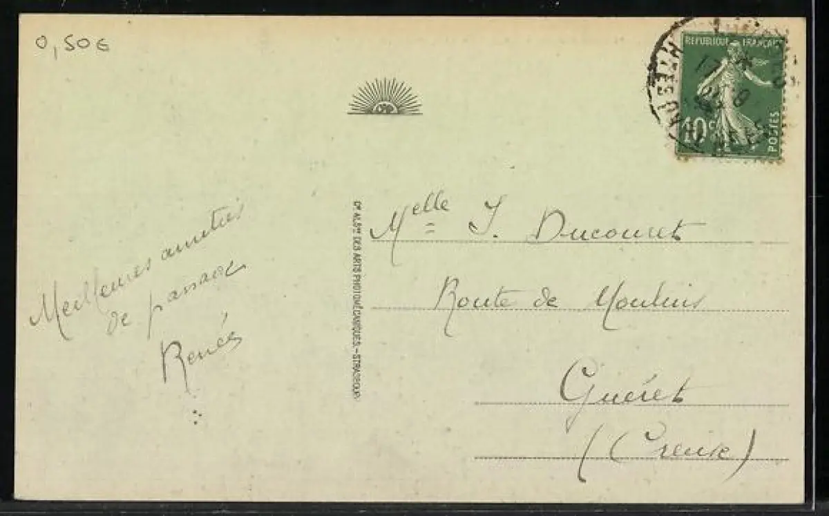 Personenbezogene Daten auf der Rückseite der Karte wurden durch blauen Textmarker unkenntlich gemacht. Die blauen Stellen sind auf die Vorderseite durchgeweicht und wirken sich negativ auf das Postkartenfoto aus
