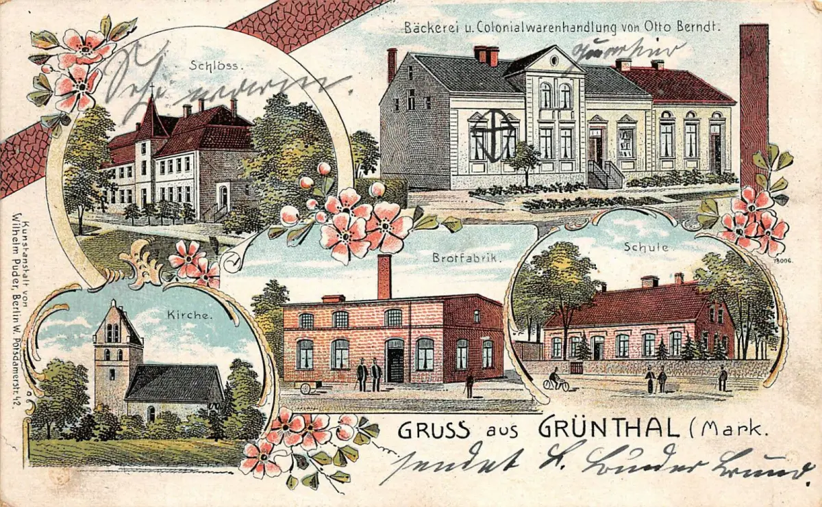 AK GRÜNTHAL Mark Brotfabrik, Bäckerei, SchuleLitho Postkarte 1909
