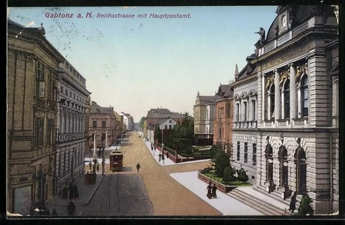 AK Gablonz, Reichsstrasse mit Strassenbahn & Hauptpostamt