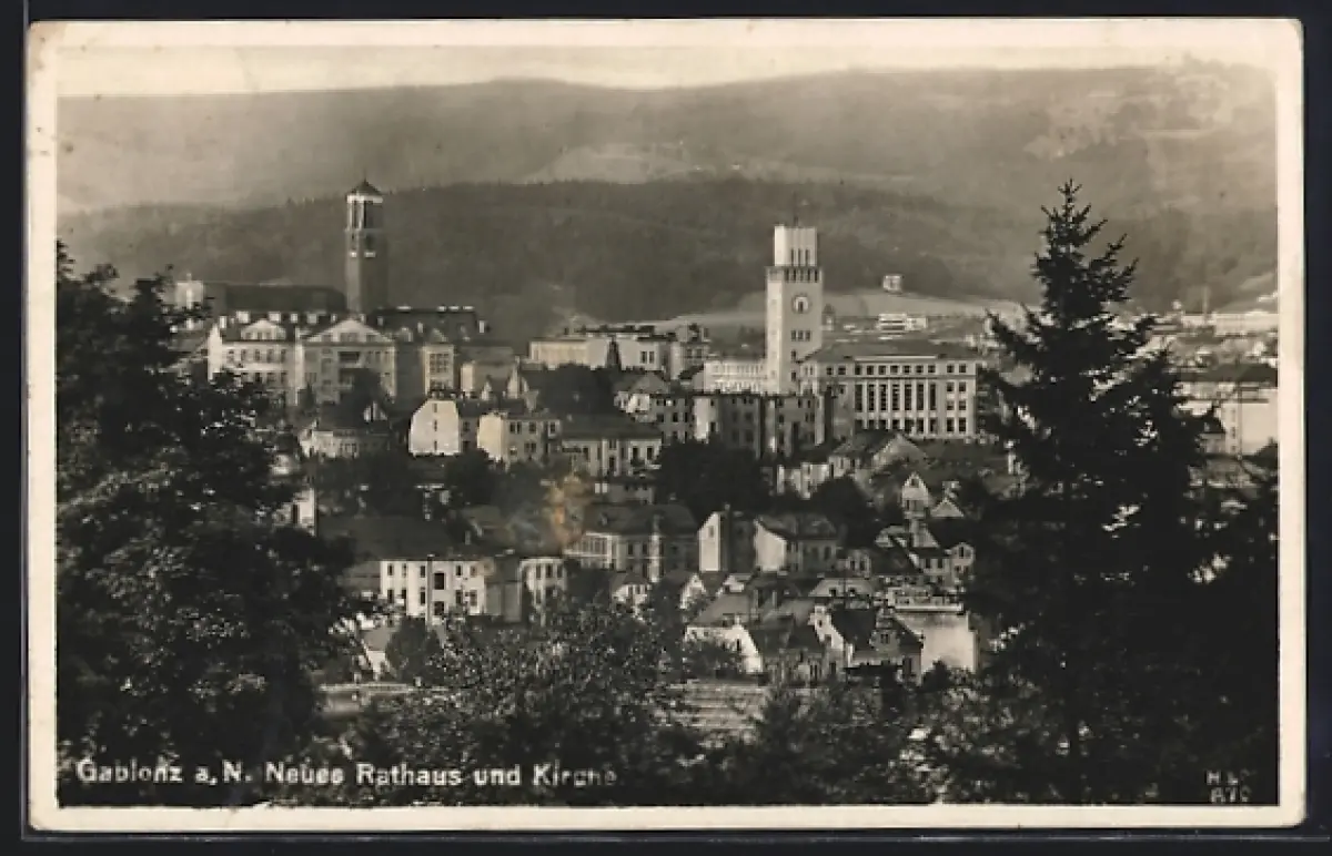 AK Gablonz a. N., Neues Rathaus und Kirche