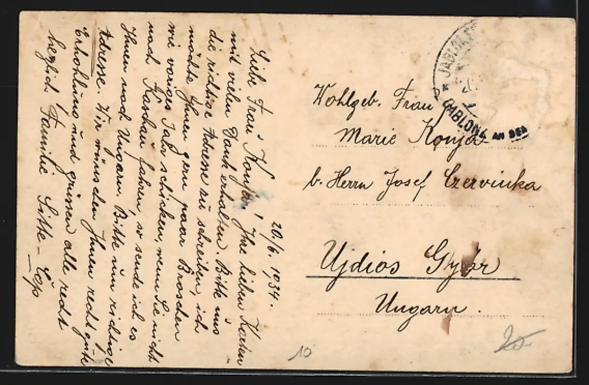 gelaufen 1934, Briefmarke entfernt, rückseitig Oberflächenschaden, Eckknick rechts oben, Bugspur links oben